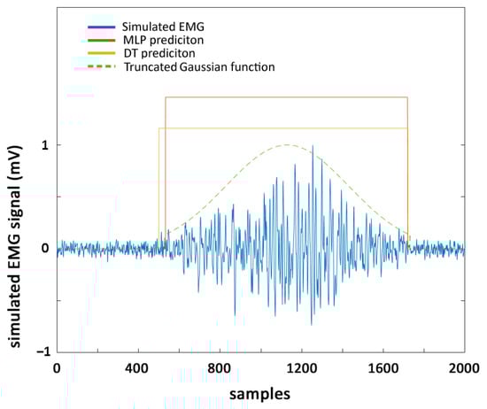 Figure 2 reports an example of simulated sEMG signal, where onset and offset events predicted by DEMANN and DT approaches (rectangular lines) are highlighted and compared with the ground truth, i.e., the truncated Gaussian function used to model the simulated signal.