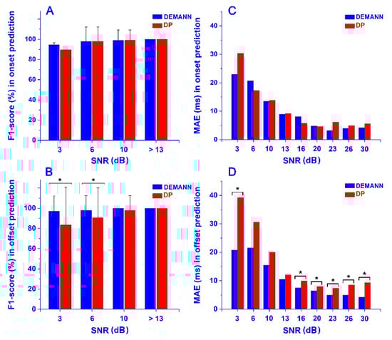 The direct comparison of performances achieved by DEMANN and DT is depicted in Figure 3, stratified for different SNR. An improvement of the F1-score of offset prediction was introduced by DEMANN for signals with SNR ≤ 6 dB (p < 0.05, Figure 3B). No significant differences were detected for SNR > 6 dB. The F1-score was comparable for onset prediction in the whole SNR range (p > 0.05, Figure 3A). Lower MAEs in onset-offset prediction were provided by DEMANN. Details of statistical significance are reported in Figure 3C,D.