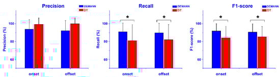 Mean (±SD) precision, recall, and F1-score computed in the onset and offset prediction by the DEMANN approach (blue bars) vs. the DT algorithm (red bars) achieved in real sEMG data during able-bodied walking. * indicates statistically significant difference.