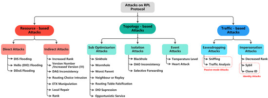 Figure 1 shows the taxonomy of RPL attacks, classified into three categories, and each category has two subclasses based on the intent of threats [23]. These attacks may cause severe network issues, such as exhausting network resources, destructing network topology, and stealing sensitive information. Further, Figure 1 lists the recent attacks addressed by the existing studies. Section 7.6 provides further details about those attacks.