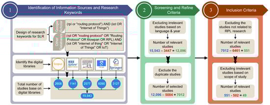 Third, there are many SLR studies related to this topic using different sets of research keywords (see Section 4.1). However, to the best of our knowledge, there are no standard keywords related to RPL and 6LoWPAN networks exist. Moreover, our search is limited to English-language studies with a restricted range of publication years (January 2016 to mid-2021).