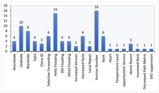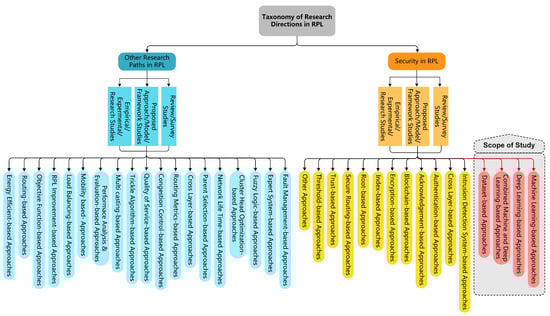 In the research of [16], the authors provided a survey on the existing challenges in IPv6 for LLNs. The authors presented a thorough background on the RPL architecture and its network operation; additionally, the authors reviewed 97 papers related to the RPL research domain. The reviewed studies were analyzed and classified into 13 categories according to RPL specifications. In addition, this work listed statistics concerned with practical parts of reviewed studies (e.g., simulation method, number of experiments, number of parameters, and other hardware and software specifications). Furthermore, the authors covered several RPL security threats, albeit partially, and offered some ideas for future research directions.