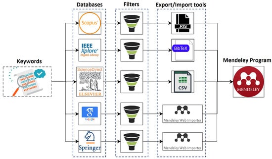 - Springer Link: We began by entering the first group of keywords (G.1) into the search engine, then refined the returned results based on document type and year of publication. Then, we downloaded the links to the selected articles as separate CSV-formatted files. Next, we downloaded the articles from the available links and imported them into Mendeley software using Mendeley’s Web Importer Tool extension [43].