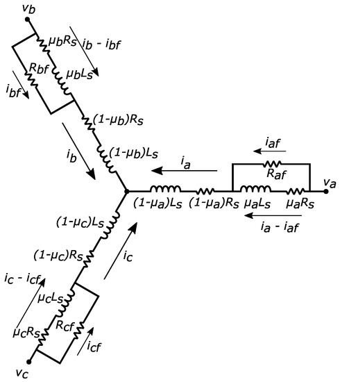 To model ITSC faults in a PMSM, it is necessary to know how the motor signals and parameters are affected by the different levels of the fault. The schematic of a PMSM stator winding under ITSC faults with different levels in each phase is shown in Figure 1. The level of fault in abc phases is denoted by , , and , respectively, which are defined by the ratio of the number of shorted turns to the total number of turns per phase winding. In a healthy condition, each phase winding of a PMSM has a resistance of and an inductance of . In the presence of ITSC faults in each phase, the phase winding is split into a faulty part with and , and a healthy part with and resistance and inductance values. As a result, there is not only mutual inductance between healthy and faulty parts in each phase winding, but also between the faulty winding with other phase windings [35]. In addition, the degraded resistance of the insulation in each phase is denoted by , , and , while the circulating fault currents are , , and , respectively. To detect an incipient ITSC fault, the resistance of the degraded path should be higher than the resistance of the shorted turns [36]. This is due to the fact that an ITSC fault forms gradually over time and starts with a low current circulating through the degraded path.