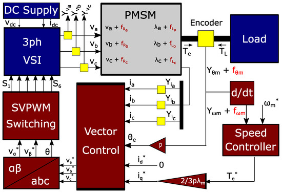 This methodology is especially effective for fault diagnosis of complex systems where a prior deep knowledge of the whole system is neither needed nor affordable in terms of computational burden and processing time. Instead, a small redundant part of the system is selected and processed to obtain smaller redundant subsystems that can be used in forming residuals for detecting each predefined fault. First, the structural model of a redundant system is formed and represented by an incidence matrix with variables as columns and equations as rows. The variables are categorized as unknown variables, known variables, and faults, while the equations are categorized as dynamic equations, measurements, and differential equations. Each row of the incidence matrix connects an equation to the corresponding variables if they are present in that specific equation. Next, the just-determined and over-determined parts of the system are separated by rearranging the rows and columns in a way to form a diagonal structure that is known as Dulmage–Mendelsohn (DM) decomposition. Using the analytic redundant part of this structure and based on the degree of the redundancy, several smaller sets of ARRs are identified. These smaller sets are called minimally over-constrained sets and have one degree of redundancy, holding exactly one more equation than the number of variables. Subsequently, a fault signature matrix is formed to demonstrate which fault can be detected or even discriminated. Finally, specific diagnostic tests (residuals) are designed to detect faults. Here, a structural analysis of a PMSM experiencing independent ITSC faults in each phase is presented, and diagnostic tests are proposed to detect and discriminate them. Figure 2 shows the modeling diagram of a faulty PMSM and the drive system where measurements are acquired by sensors and faults are located inside the motor.