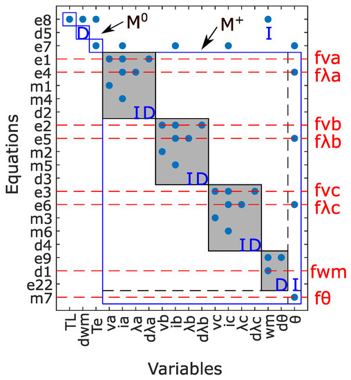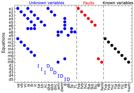 This canonical decomposition is achieved after the rows and the columns of the main structural graph (structural model incidence matrix) are rearranged so that the matched variables and constraints appear on the diagonal. Therefore, having a decomposition tool that analyzes the redundancy of the structural model and forms this diagonal structure is very beneficial. Dulmage–Mendelsohn (DM) is a key decomposition tool that is applied on a structural model directly and obtains a unique diagonal structure by a clever reordering of equations and variables [39]. Figure 5 shows the DM decomposition for the PMSM structural model, where the analytic redundant part is expressed in the bottom-right part containing all the faults. Since this part includes redundancy and can be monitored, diagnostic tests can be designed with the set of ARRs in . As a result, if a fault is defined in the model and is supposed to be detected by the diagnosis system, a residual that is sensitive to the presence of that fault must exist.