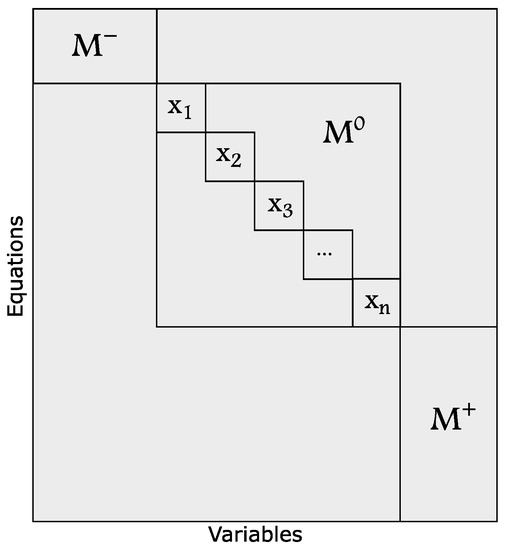 where denotes the number of equations, and is the number of unknown variables contained in the model M. According to bipartite graph theory, any finite dimensional graph such as can be decomposed into three sub-graphs as follows [37]: