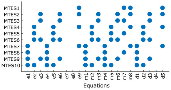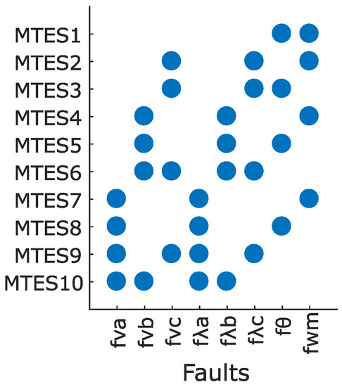 where is the set of faults that influence any of the equations in M. A TES M is a minimal test equation support (MTES) if there exists no subset of M that is a TES holding the degree of redundancy of one. Following the algorithm in [38], the structural model is subdivided into efficient redundant MTES sets. Each MTES set contains a group of ARRs that together hold the degree of redundancy of one, meaning that there is only one equation more than the number of variables involved. In addition, they are obtained in a way that the effect of faults is considered. This reduces computational complexity significantly without reducing the possible diagnosis performance as compared to structurally over-determined (MSO) sets. Figure 6 shows all the MTES sets found for the considered structural model here, where each row of the matrix connects the corresponding MTES to the equations involved.