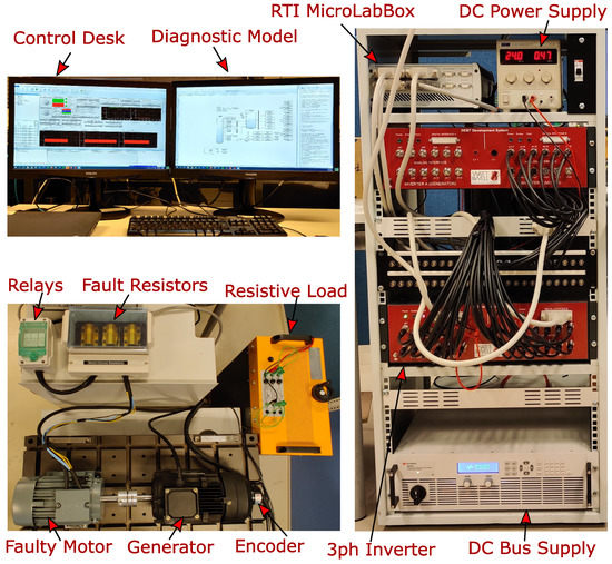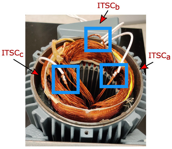 The proposed diagnostic method is implemented and validated through an in-house experimental setup in this section. First, ITSC faults were applied to the phase windings of a four-pole PMSM, as shown in Figure 8. Each phase winding of the motor has two coils in series, each of which has 51 turns with three parallel branches. For phase a, one of the turns was short circuited, or about a 1% fault level. For the phases b and c, three and five turns were short circuited, resulting in almost 3% and 5% fault severity, respectively. The connection wires to these extra taps in the phase windings were taken out of the motor and connected to 100 mΩ resistors (similar to Figure 1) both to limit the short circuit current and to simulate the winding insulation degradation, as shown in Figure 9. Furthermore, controllable relays were placed between winding taps and fault resistors to activate or deactivate the fault. The faulty motor was mechanically coupled to a generator as a variable load and an incremental encoder to measure the rotor’s angle and velocity. The motor was driven by a Watt&Well DEMT 3-ph voltage source inverter, which had embedded voltage and current sensors, being fed by a Keysight N8949A dc supply. In addition, a dSpace MicrolabBox control unit was used as a real-time interface device for implementing both control strategy and data acquisition from Matlab/Simulink with a sampling time of . The parameters of the studied PMSM are listed in Table 1.