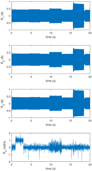 The known variables consist of the motor signals, which are measured for both control purposes and fault diagnosis. Thus, in addition to the three-phase currents and angular position, i.e., , , , and that are necessary for the control system. Three-phase voltages, i.e., , , and , are also measured to complete the diagnostic system. Equation (3) shows these known variables, where and fault terms are also added to account for speed and angle measurement error.