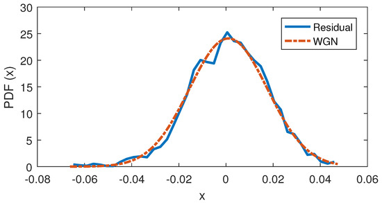 Before going through the design process, it is beneficial to know the PDF of the measurement noise signal. This gives us enough knowledge to make the assumptions that are close to our realistic problem. Using the first part (t = 0–1 s) of the resultant residual in Figure 11, the PDF of the noise signal in a noise-only hypothesis is obtained and shown in Figure 12. The PDF of the noise signal in Figure 12 is very close to the PDF of a white Gaussian noise (WGN), thus it can be reasonably modeled with a WGN probability distribution function.