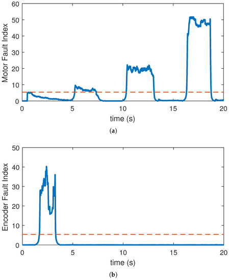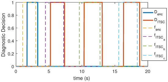 In previous studies, a GLRT-based detector has been implemented for stator imbalancefault detection in induction motors [44]. The noise parameters were also considered unknown, and therefore, they have been replaced with their MLEs. Moreover, a threshold was calculated based on and , which makes the diagnostic system experience fewer false alarms. However, the first fault level that the system can detect is of stator-phase resistance, which is a quite high level of fault severity. As a result, the system would go into severe imbalance from the time that the fault appears until the time the diagnostic system detects it. In our case, even if the was chosen as , the for ITSC in phase a would be , the for ITSC in phase b would be , the for ITSC in phase c would be , and the for the encoder fault would be . Thus, the diagnostic system still detects the smallest fault, even with . However, knowing that a slightly higher probability of a false alarm is not that irritating (), a better probability of detection is achieved () in our study based on setting a lower threshold. Other studies with different methods have also chosen a higher level of fault as the starting point. A Kalman filter for detection of ITSC in PM synchronous generators has been implemented in [45], which can successfully detect fault levels as low as . In addition, a combination of an extended Park’s vector approach with spectral frequency analysis was introduced in [46] which could successfully detect three shorted turns in synchronous and induction motors.