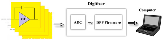 The pulse shaping processing of the CSP output pulses was performed through a digital approach, using 16-channel digital electronics, developed at DiFC of the University of Palermo (Palermo, Italy) [48,49,50]. The digital electronics were based on commercial digitizers (DT5724, 16-bit, 100 MS/s, CAEN SpA, Italy; https://www.caen.it, accessed on 26 April 2022), where a dedicated firmware was uploaded [48,49,50]. The potentialities of the digital pulse processing approach are now widely recognized [51,52,53]; in our case, the flexibility of this approach, due to the possibility of using different pulse shaping features, was a key point for our investigation.