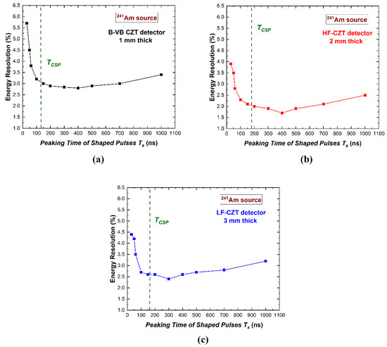 Measurement of the energy resolution (FWHM) at 59.5 keV vs. the peaking time of the shaped pulses. The results for the (a) B-VB CZT pixel detector, (b) HF-CZT pixel detector, and (c) LF-CZT pixel detector. The green dashed vertical lines represent the mean value of the peaking times TCSP of the CSP output pulses.