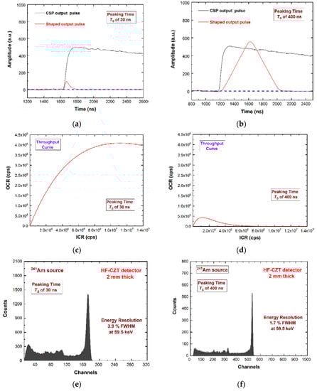 The preamplifier output pulses (black lines) and the shaped output pulses (red lines) with peaking times TS of (a) 30 ns (ballistic deficit pulse processing) and (b) 400 ns (energy resolution pulse processing). The calculated throughput curves, i.e., the output counting rate (OCR) vs. the input counting rate (ICR), with TS of (c) 30 ns and (d) 400 ns. The throughput curves were calculated considering paralyzable dead times (the full-time width of the shaped pulses over the threshold) of 90 ns and 850 ns for TS = 30 ns and 400 ns, respectively. The measured 241Am energy spectra with TS equal to (e) 30 ns and (f) 400 ns. To optimize the binning of the pulse heights of the shaped pulses at TS of 30 ns, we used an amplitude gain equal to 2.