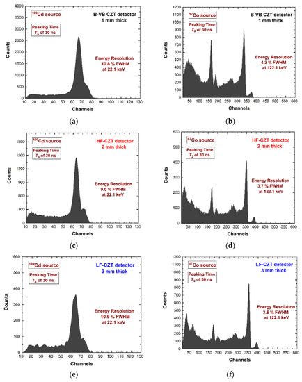 - Abbene, L.; Principato, F.; Gerardi, G.; Buttacavoli, A.; Cascio, D.; Bettelli, M.; Amadè, N.S.; Seller, P.; Veale, M.C.; Fox, O.; et al. Room-Temperature X-ray response of cadmium-zinc-Telluride pixel detectors grown by the vertical Bridgman technique. J. Synchrotron Rad. 2020, 27, 319–328. [Google Scholar] [CrossRef] [PubMed]