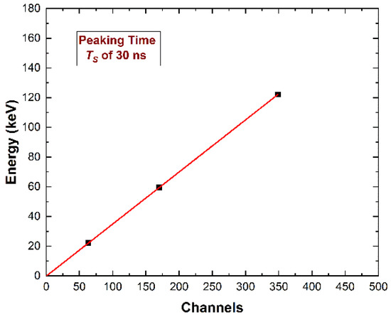 We used two different pulse shaping set-ups: the first with a TS of 30 ns selected for high throughput (ballistic deficit pulse processing), the second with a TS of 400 ns for the best energy resolution (energy resolution pulse processing). The mean value of the time widths of the shaped pulses over the detection threshold was 90 ns and 850 ns for TS of 30 ns and 400 ns, respectively. This time width was a dead time for the system and can be modelled as paralyzable dead time [26,56]. If a second pulse arrives while the first pulse is still above the detection threshold, the second pulse overlays the first, and extends the dead time by its width from its arrival time. Because the system counts threshold crossings, it will count only the first pulse. In agreement with the paralyzable dead time model, we calculated the throughput curves at the two-pulse processing set-up. The ballistic deficit pulse processing (dead time of 90 ns) ensured a maximum output counting rate (OCR) of 4.1 Mcps (Figure 6c), while the energy resolution pulse processing was of 0.43 Mcps (Figure 6d). Further energy spectra using the ballistic deficit pulse processing are shown in Figure 7.