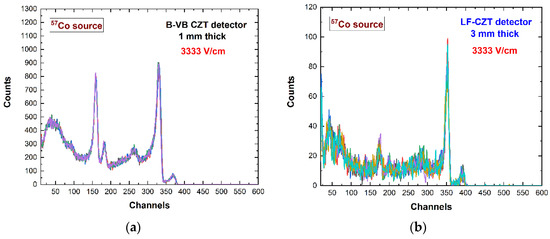 The energy spectra measured with the (a) B-VB CZT pixel detector and (b) LF-CZT pixel detector within a time window of one hour. For each time window of one hour, we measured six energy spectra with an acquisition time of ten minutes. 57Co sources with different activity were used. The time stability was verified.