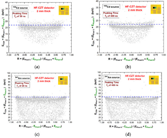 The effects of the ballistic deficit pulse processing on the charge sharing measurements were also investigated. Typically, charge sharing is strongly present in sub-millimetre CZT pixel detectors. The percentage of charge sharing events is very high, of about 50–60% for the pixels with 500 μm pitches [23,48]. As it is well known, the energy of the shared events can be recovered by summing their energies, measured in temporal coincidence. However, the energy recovered after charge sharing addition (CSA) is often characterized by deficits, due to the presence of charge losses at the inter-pixel gap [57,58,59,60,61,62,63,64,65]. In our case, we investigated the effects of ballistic deficit pulse processing on these charge losses. Figure 10 shows the scatter plots of the summed energy ECSA versus the sharing ratio R. The energy ECSA = (EPixel5 + EPixel8) was the sum of the energies of two coincidence events between two adjacent pixels, i.e., after CSA, while the charge sharing ratio R was calculated from the ratio between the energy of the two coincidence events, as follows: R = (EPixel5 − EPixel8)/(EPixel5 + EPixel5). R is typically used to provide information about the interaction position of the shared events within the inter-pixel gap.