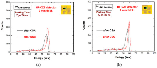The plots on the left side were obtained using ballistic deficit pulse processing; on the right side, we used energy resolution pulse processing. Despite the poor energy distribution of the shared events (poor energy resolution), the ballistic deficit pulse processing did not increase the charge losses after CSA. This result is also shown in Figure 11, where the energy spectra after CSA (black lines) are presented. The charge losses (3 keV at 59.5 keV) were the same for both shaping processing approaches, even if the energy resolution of the energy spectra after CSA was poorer for the ballistic deficit pulse processing. Moreover, the correction of these charge losses was successfully performed for both processing approaches (red lines) through the application of a charge sharing correction (CSC) technique developed by our group and presented in our previous works [23,63]. The best energy resolution of the corrected energy spectra after CSC (red lines) was obtained with energy resolution pulse processing.