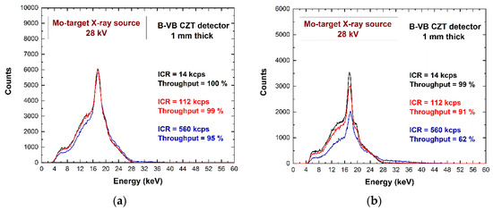 The Mo-target X-ray spectra at different input counting rates (ICRs). (a) Ballistic deficit pulse processing; (b) energy resolution pulse processing.