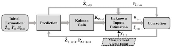 Let and be the improved estimates of the state vector and unknown input vector , respectively. Based on the EKF-UI algorithm, they can be obtained recursively by following the flowchart given in Figure 1 and the steps presented in Appendix A.
