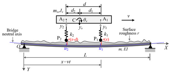 For the monitoring of bridges, the use of a test vehicle with two axles is more convenient than the one with a single axle for its ability to self-stand. Moreover, the residual response generated by the two axles is roughness free, which will be utilized in retrieving the surface profile. Consider a two-axle test vehicle moving over a simply supported bridge, as shown in Figure 2. The vehicle (body) is simulated as a rigid beam of mass and moment of inertia , and supported by two springs spaced at d and of stiffnesses and . The vehicle is asymmetric in that its center of gravity, C, is unequally spaced from the front axle A1 and rear axle A2, i.e., with distances and , respectively. Consequently, two DOFs are needed for the vehicle to simulate its vertical and rotational motions and . The bridge is modeled as a Bernoulli–Euler beam of span length L, elastic modulus E, moment of inertia I, and mass per unit length m. For the test vehicle, only the acceleration responses are of concern, since they can be easily measured in practice. The vehicle damping is ignored in the analytical formulation, for a good test vehicle is to be designed with the least damping for better transmissibility. However, bridge’s damping will be included in the finite element simulation as it cannot be ignored.