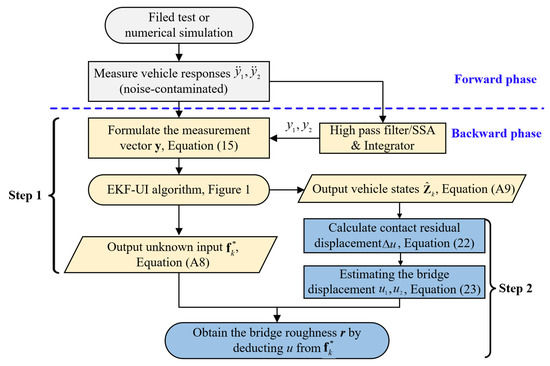It should be noted that the vehicle responses in Equation (15) are those measured in the field, which may be polluted by noise, including ambient vibrations. To this end, one can employ the EKF-UI algorithm (Step 5) in Section 2 to obtain the improved state vector . In other words, by using the state and measurement equations established for the vehicle in Equations (13) and (16), one can estimate from the recorded responses and the improved vehicle state vector and unknown input vector by the EKF-UI procedure described in Equations (A1)–(A10) and Figure 1.