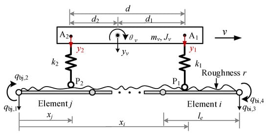 For the two-axle vehicle passing a bridge, it can be modeled by the VBI element shown in Figure 4, where the axle interval d is assumed to be greater than the element length le, and the front and rear axles (wheels) are in contact with elements i and j at points P1 and P2, respectively. Considering the bridge surface roughness, the equation of motion for the VBI element can be expressed as: