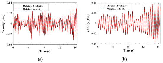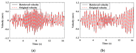 As indicated by Equation (A9), the improved (noise-reduced) vehicle state can be obtained recursively from the contaminated measured response using the EKF-UI algorithm. The purpose herein is to validate the result retrieved from the vehicle state, including the velocity and displacement responses of the two axles, as defined in Equation (15). To validate the applicability of the proposed procedure to various roughness qualities, both roughness Classes A and C are selected to represent good and poor surface conditions, respectively. For the two-axle vehicle moving over the surface roughness of Classes A and C, the axle responses retrieved from the noise-contaminated vehicle response by the EKF-UI algorithm were compared with the original responses (with no noise) in Figure 5, Figure 6, Figure 7 and Figure 8, where parts (a) and (b) denote the responses of the two axles. As revealed by the figures, all the retrieved responses match well with the original ones, confirming that the EKF-UI algorithm is effective for removing the measurement noise from the measured vehicle responses through the recursive procedure.