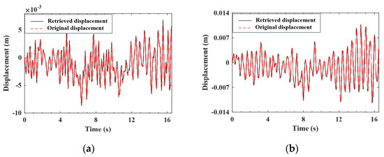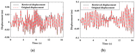 Retrieved and original displacement responses of the test vehicle (Class A roughness). (a) front axle; (b) rear axle.