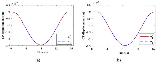 It is interesting to note that the flexural rigidity EI is the only property of the bridge involved in Equation (28) for calculating the contact displacements, and that it will be canceled out since it appears both in the numerator and denominator. Consequently, the coefficients and depend only on the vehicle’s parameters and location on the bridge, all of which are known during the test. In other words, the coefficients and can be readily made available for each test vehicle. By the way, Equation (28) is also applicable to the case with a slight local reduction in flexural rigidity via the involvement of bridge deflections [53]. It should be recalled that the quantity was already made available via the use of Equation (22). Inasmuch as one can calculate the vehicle–bridge contact displacements by substituting Equation (28) into Equation (23) to yield and , which are also roughness free. The reliability of the above procedure for calculating the contact displacements will be verified by the FEM in Section 4. Finally, the surface profile of the bridge can be recovered by deducting from the estimated input .