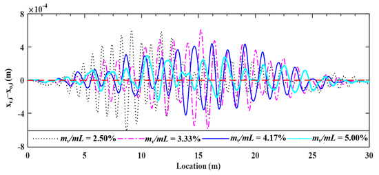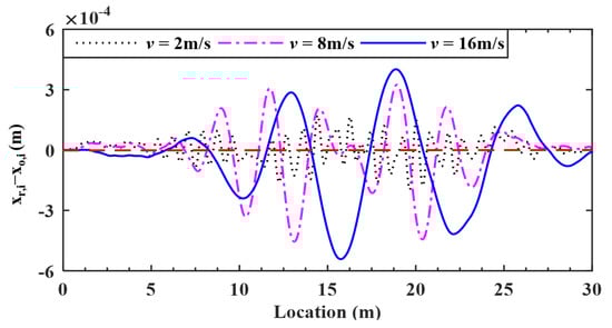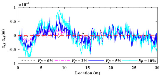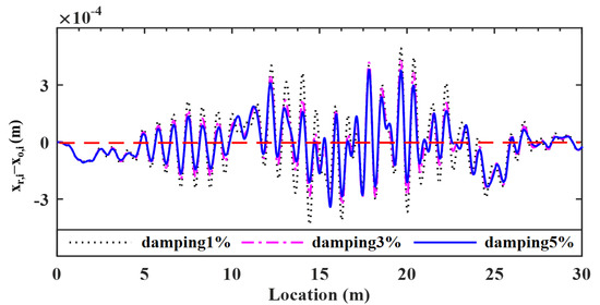 For the VBI system, damping may affect the transmissibility of vibrations and therefore the retrieval of the bridge profile. Vehicle’s damping is required to be as low as possible and in many cases adjustable, but bridge’s damping in fact can hardly be adjusted. As such, it is necessary to study the effect of the bridge damping on the proposed method. Three damping ratios of 1.00, 3.00 and 5.00% of the Rayleigh type are considered for the bridge. The deviations of the retrieved response from the input bridge surface profiles are plotted in Figure 15, and the corresponding error indicator RMSEs found are 4.33, 3.66 and 3.43%, respectively.