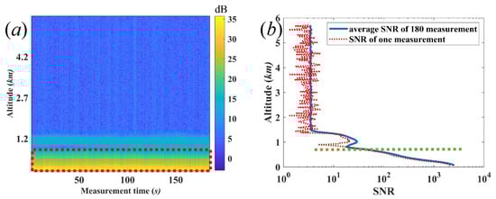 (a) SNR image of successive 180 measurements, (b) SNR of one measurement, and the average SNR of 180 successive measurements. The PBL is in the red rectangular area. The green dashed line denotes the top of PBL, which can be considered as the MLH.