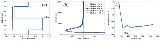 where and are the spatial ranges in the profile, is the profile as a function of altitude and the normalization factor, and , is the inverse of the dilation. The first step in the algorithm to determine the PBLH is to define the dilation of the Haar function values. Figure 2b indicates the WCT of SNR with different dilation. The minimum of WCT was chosen as an objective parameter to find its optimal value of dilation. Figure 2c shows the minimum of WCT dependent on the dilation, and the position of the minimum value was chosen as the appropriate dilation for Haar function. The corresponding dilation is 60 m.