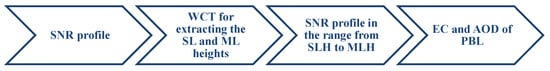 The WCT was applied to the profile with the dilation of 60 m for the Haar function. Figure 3 demonstrates that the position is identified by the local minimum value in the resulting wavelet covariance profile and indicates the height of the strongest decrease of SNR. The altitude of 180 m can be considered as the SLH that is larger than the blind zone of 60 m. is determined by the local minimum value in absolute value of , which means the local minimum value of SNR, and the height could be seen as the MLH with an altitude of 840 m. The SLH and MLH are consistent with the results in reference []. The local maximum positions of absolute WCT can be automatically determined by dilation operation, which is defined as , where I represents the signal and E denotes the structuring element []. The dilation operation has a filtering effect that suppresses dark regions smaller than structuring elements and results in the enlargement of bright ones. The dilation operation can be recast into maximum operation on structuring elements.