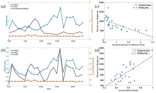 (a) SLH, MLH, and AEC during local time, and (b) SLH, MLH, and AOD during local time. MLH is a linear relationship with (c) AEC and (d) AOD.
