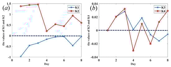 SLH is linearly correlated with AEC and AOD, and Figure 6b shows the distribution of the slopes and in eight successive days. The values are sometimes positive and sometimes negative, which means that the linear fitting curves of SLH dependent on AEC and AOD are complex. The reasons are the multiple factors such as the cooling effect of the surface enhanced with the increase of AOD and aerosols with human activity.