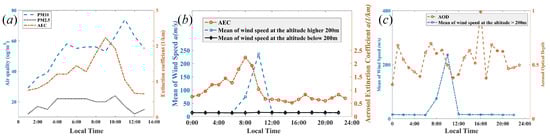 In order to study the factor of aerosols with different sizes on AEC, the data of and are obtained from the National Urban Air Quality data of the Ministry of Ecology and Environment, PRC []. Figure 7a indicates the positive correlation between AEC and aerosols ( and ) during the local time. The Pearson correlation coefficient provides a measure of the strength of the linear association between two variables [], and it is found that the correlation coefficient between the derived AEC and aerosols ( and ) are 0.1026 and 0.5890, which suggested that aerosol of plays an important role in the determination of AEC. Additionally, Figure 7b demonstrates that there are positive statistical associations between AEC and the mean of wind speed, which is estimated by the same CDWL. However, AOD is not positively related to the mean wind speed. Thus, the factors considered for AEC are much simpler than AOD.