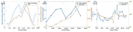 The comparison of the AEC with the optical absorption coefficient (OAC) is based on photoacoustic spectroscopy at the wavelength of 1064 nm [], and it is found that the trend of the AEC is highly correlated with the OAC, shown in Figure 8a. Furthermore, the reference data of AOD and MLH were obtained from EAC4 (ECMWF Atmospheric Composition Reanalysis 4) [], which is the fourth generation ECMWF global reanalysis of atmospheric composition, and reanalysis combines model data with observations from across the world into a globally complete and consistent dataset using a model of the atmosphere based on the laws of physics and chemistry. Figure 8b,c demonstrate that the trends of AOD and MLH are related to that in EAC4. Thus, it is feasible that the simultaneous extraction method of the planetary boundary-layer height and aerosol optical properties can be obtained from coherent Doppler wind lidar.
