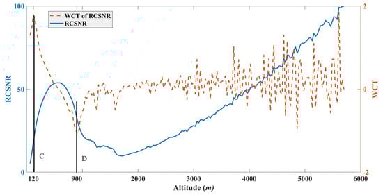 Figure 9 shows the RCSNR and the corresponding WCT and demonstrates that the local maximum of WCT of RCSNR is at the altitude of 120 m. It is lower than 180 m, as shown in Figure 3. Thus, the local maximum of WCT of RCSNR is the location of SLH, which is consistent with the classical WCT method. However, the classical method cannot obtain the MLH, and the AEC between the SL and ML cannot be estimated. In order to overcome it, the local minimum values of WCT based on RCSNR are employed at the location of altitude of 900 m, which is smaller than the 840 m extracted by our algorithm. Therefore, the MLH can be defined as the local minimum values of the WCT of RCSNR.