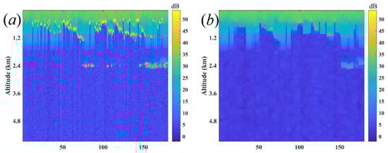 In addition, the cloud has a strong effect on the accurate extraction of PBLH, and the opening filter, which is defined as the two sequential compositions of erosion and dilation, can be first applied to the SNR image to reduce the cloud before the mean of 180 measurements of SNR. Figure 10a shows that the bright spots are the clouds due to the strong scattering, and the clouds can be filtered with an opening operation, as shown in Figure 10b.