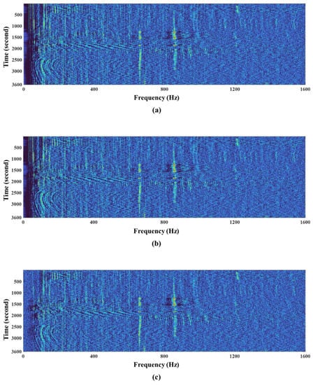 Illustration of LOFAR-grams of sensor signals from (a) sensor #1, (b) sensor #2, and (c) sensor #3.