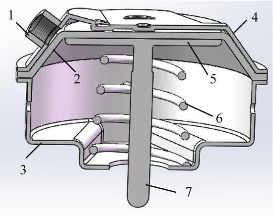 3D profile view of diaphragm brake chamber. 1—Compressed Gas Inlet, 2—Rubber Diaphragm, 3—Lower Cover, 4—Upper Cover, 5—Piston Disc, 6—Return Spring, 7—Pusher.