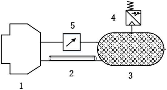 Hardware test system of PCR for commercial vehicle brake chambers. 1—pneumatic triplet, 2—on–off valve, 3—air reservoir, 4—differential pressure sensor, 5—laminar flow resistance tube, 6—isothermal container, 7—electrical proportional valve.