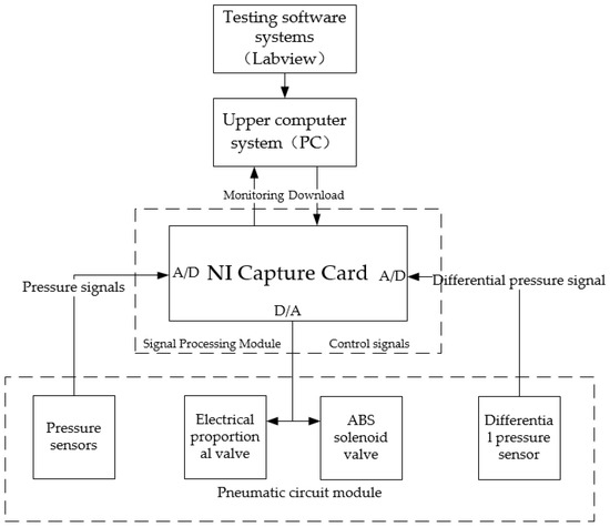 The PCR test system for commercial vehicle brake chambers consists of four parts: a pneumatic circuit module, a signal processing module, an upper computer system and a test software system. The overall structure scheme of PCR test systems for commercial vehicle brake chambers is shown in Figure 3.