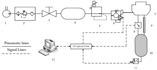 Pneumatic circuit diagram of the PCR test system for brake chambers. 1—air source, 2—pneumatic triplet, 3—on–off valve, 4—air reservoir, 5—electrical proportional valve, 6—ABS solenoid valve, 7—brake air chamber, 8—differential pressure sensor, 9—laminar flow resistance tube, 10—isothermal container, 11—pressure sensor, 12—industrial computer.