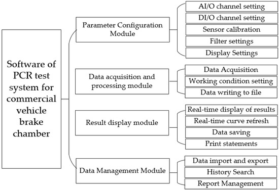 The software of the PCR test system for commercial vehicle brake chambers is developed by using the modular programming method. The system includes a parameter configuration module, data acquisition and processing module, result display module and data management module. The modules and their functions are shown in Figure 6.