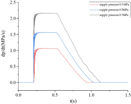 The air source pressure is set to 0.7 MPa and the air supply pressure is set to 0.3 MPa, 0.5 MPa and 0.7 MPa, respectively. The inlet valve of the ABS solenoid valve is set to remain open and the exhaust valve is set to remain closed. The pressure rise process of the commercial vehicle brake chamber is simulated, and the PCR curve of the brake chamber is obtained as shown in Figure 11. The PCR change rule of the brake chamber is consistent in the process of inflation under different air supply pressures. The higher the supply pressure, the higher the PCR peak of the brake chamber, and the more obvious the fluctuation of the PCR at the initial stage of the brake chamber’s inflation. The response time of the PCR of the brake chamber is not related to the initial supply pressure.