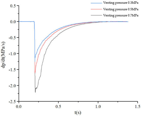 The initial pressure inside the commercial vehicle brake chamber is set to 0.3 MPa, 0.5 MPa and 0.7 MPa respectively. The inlet valve of the ABS solenoid valve is set to remain closed, and the exhaust valve is set to remain open. The pressure drop process of the commercial vehicle brake chamber is simulated, and the PCR curve of the brake chamber is obtained as shown in Figure 12. The PCR change rule of the brake chamber is consistent in the process of bleeding at different initial pressures. At the beginning of the brake chamber’s bleeding, there is a time delay for the pressure drop, and the PCR is 0. Then, the pressure inside the brake chamber starts to drop, and the absolute value of the PCR increases rapidly to the maximum value. When the pressure inside the brake chamber is completely discharged, the PCR of the brake chamber becomes 0.